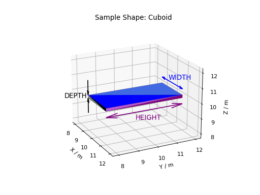 All objects are defined with respect to cartesian axes (x,y,z), and the default unit of all supplied values are metres(m). Objects may be defined so that the origin (0,0,0) is at the centre, so that when rotations are applied they do not also apply an unexpected translation.