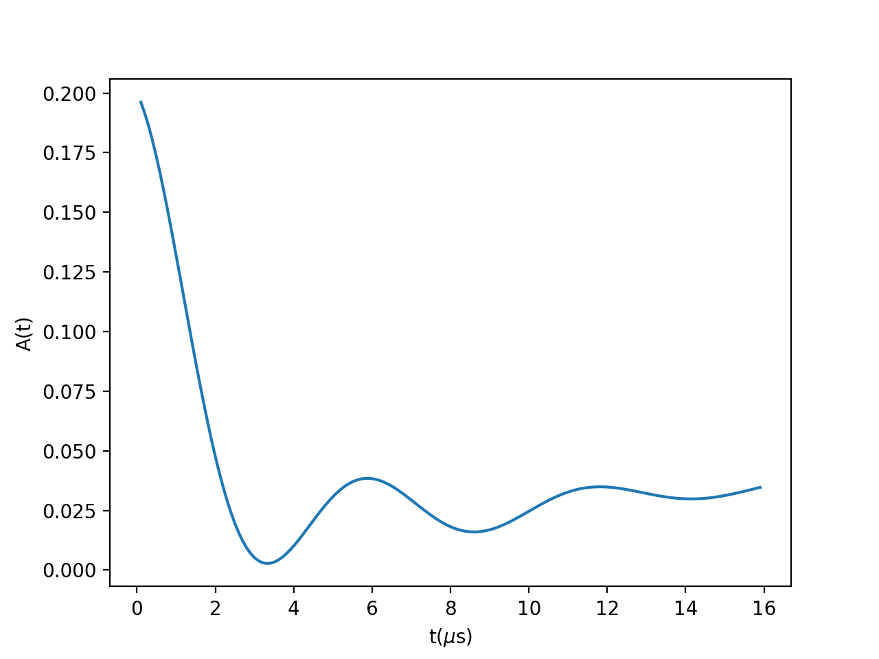 \[A(t)=\frac{A_0}{6}\left(1+e^{-\lambda t}\left(\cos(g_\mu B_\text{D} t)+ 2\cos(\frac{3}{2}g_\mu B_\text{D} t)+2\cos(\frac{1}{2}g_\mu B_\text{D} t)\right)\right)\]