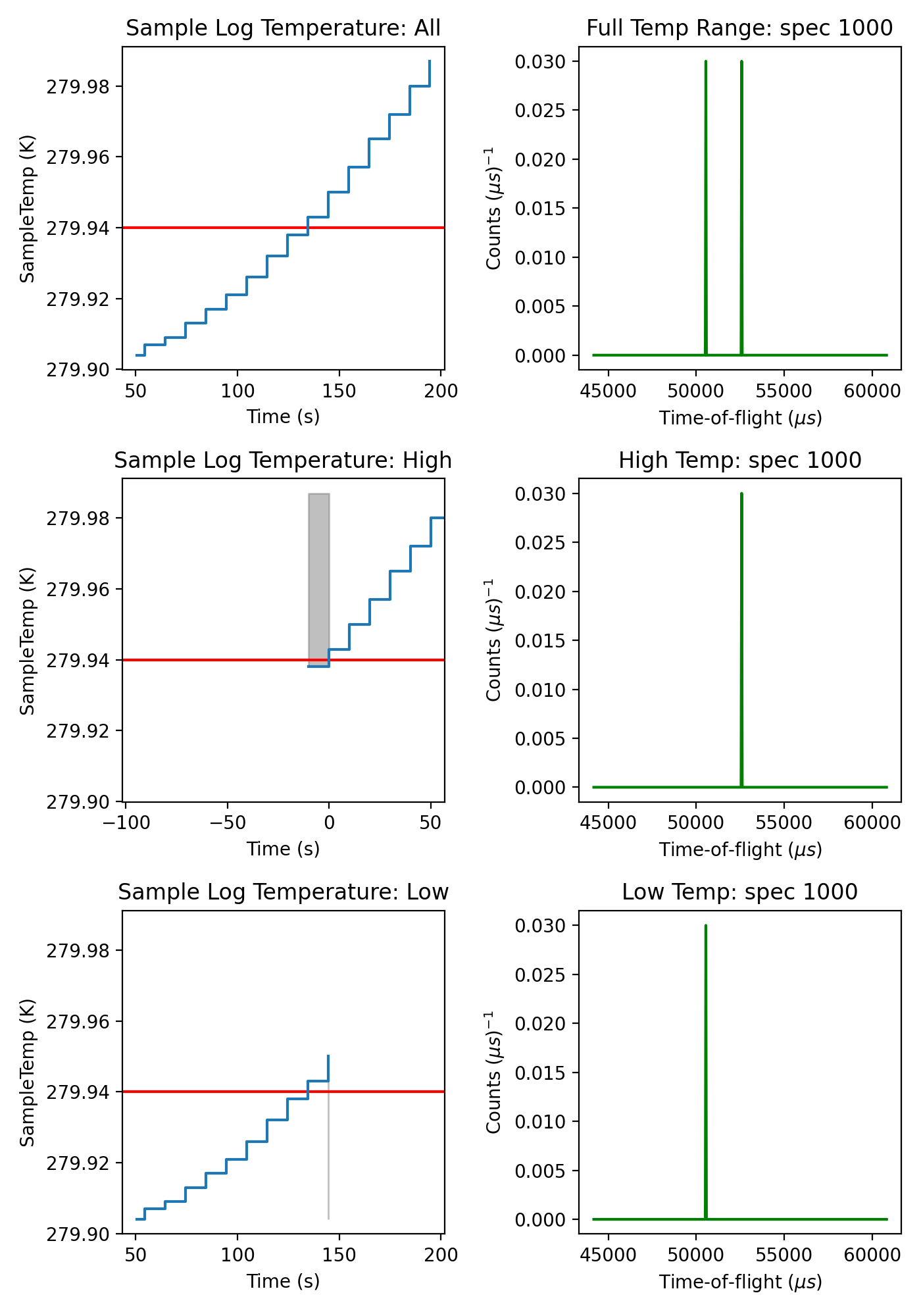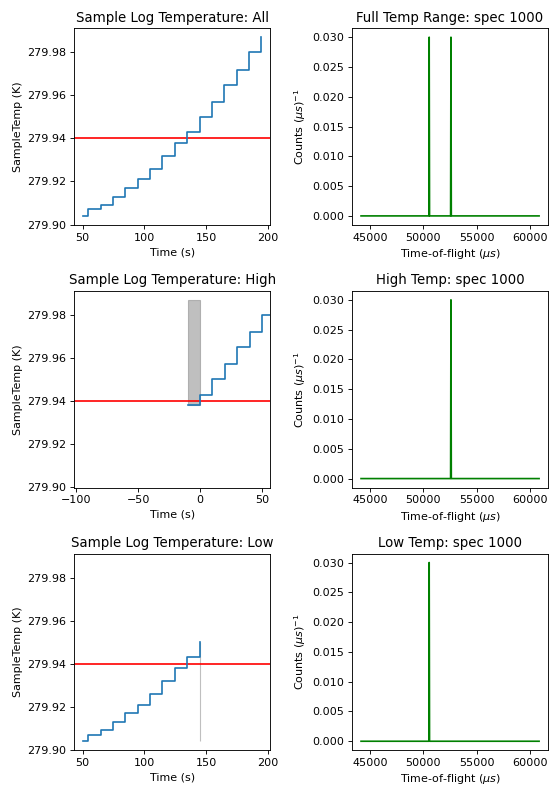 Look at the effect this filter has on the SampleTemp log and in particular on the data in spectrum number 1000. Note that the time for the high temperature sample log data has reset its minimum value to 0 as it doesn’t have the start time value needed to calculate the relative time (the start of the logs here is where we made the cut).