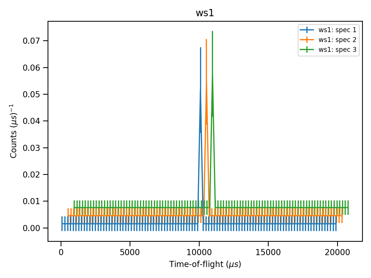plotSpectrum(ws1,spectrum_nums=[1,2,3],error_bars=True, waterfall=True)