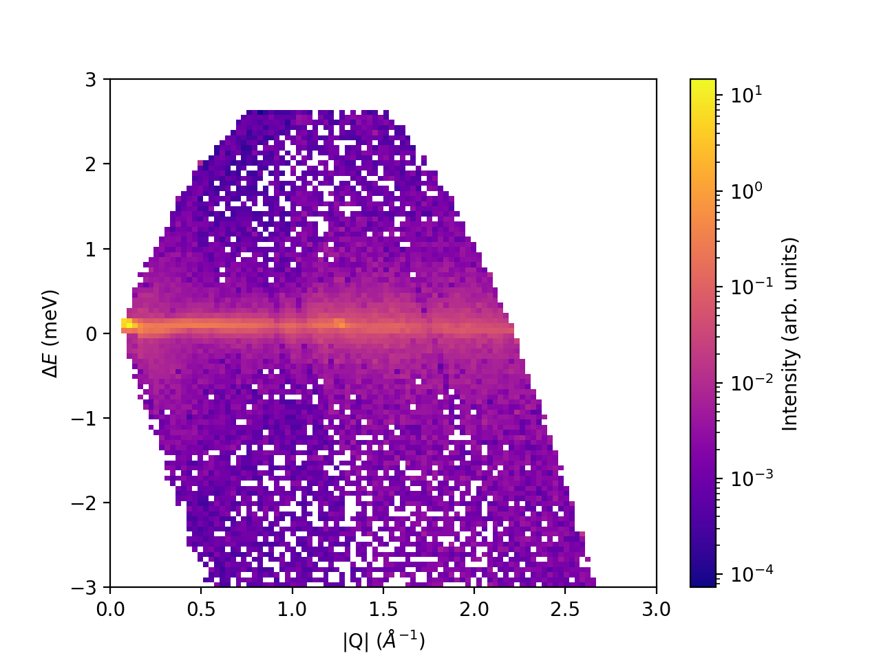 sqw = BinMD(InputWorkspace=md,AlignedDim0='|Q|,0,3,100',AlignedDim1='DeltaE,-3,3,100')