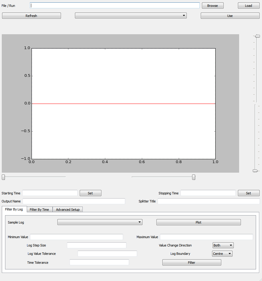 For the data loading step, MantidWorkbench provides an interface in which the user shall select the appropriate file via Browse button or by entering an integer as a valid run number in the File/Run field, if the instrument name is set up in Mantid. The user must provide a file, which contains valid sample logs for splitting and EventWorkspace. The data will be loaded once the user has clicked upon the Load button. With the help of drop-down list, user is be able to load more than one file and then click on the Use button which will load the selected file. If the file cannot be found in the drop-down list then user can click Refresh button which should update the drop-down list and enable user to select any browsed file.