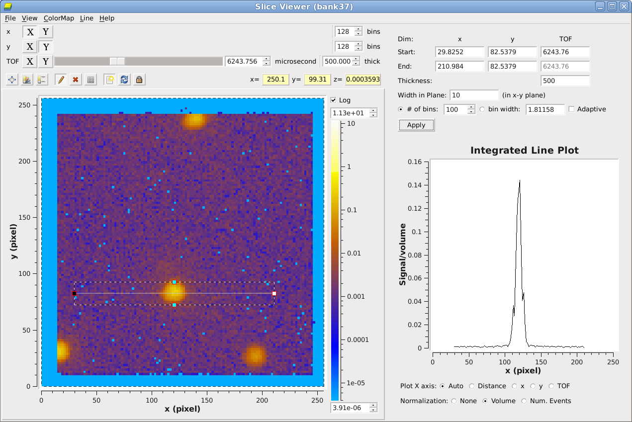 Once created, the MDEventWorkspace can be viewed in the Sliceviewer. It can also be rebinned with different parameters using BinMD v1. This allows you to view the data in detector-space. For example, you might use this feature to look at your detector’s sensitivity as a function of position, as well as a function of TOF. You can also do line plots of the data. See this screenshot for example: