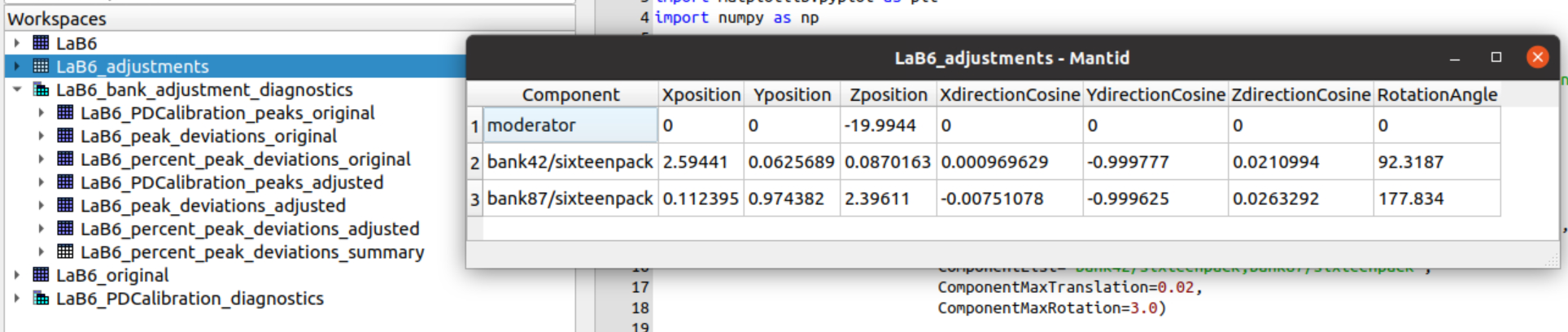 Workspace LaB6_adjustments is the main result, a table containing adjustments for different instrument components.