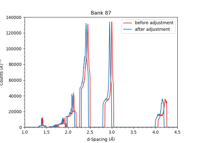 LaB6_PDCalibration_peaks_originalandLaB6_PDCalibration_peaks_adjustmentscontains one fitted-intensity spectrum per bank versusd-spacingbefore and after the banks are adjusted.