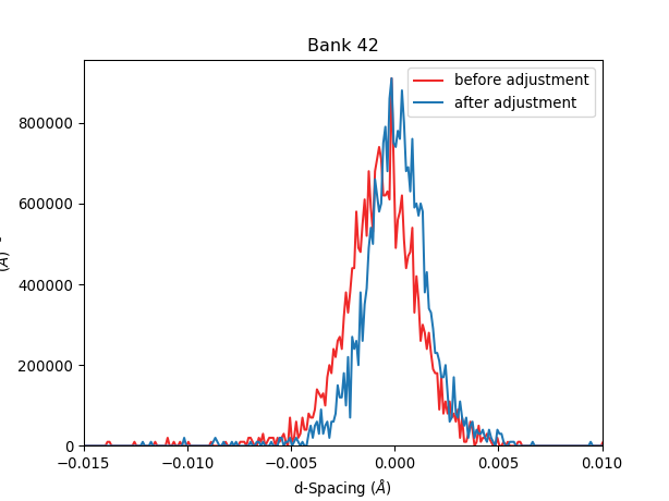 LaB6_peak_deviations_originalandLaB6_peak_deviations_adjustmentfinds for each peak the difference between the peak center and the reference d-spacing value we know from the standard. These peak center deviations are collected for all peaks found in the pixels of the bank, and then histogrammed.