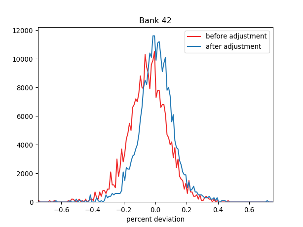 Adjusting the bank removes the previously observed systemic deviation and modestly reduces the FWHM of the histogram.