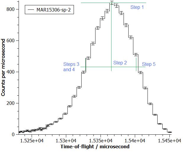 Not all neutrons arrive at the monitors at the same time because their kinetic energies, and therefore velocities, are all different. The time of arrival of the neutron pulse is taken to be the mean of the two half peak height locations. The half height points are found as follows: