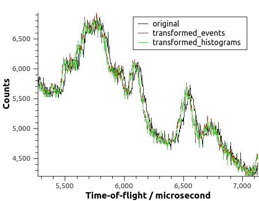 Here’s the result of applying ModeratorTzero to both the event list and the histogrammed data of a run in the VISION beamline. The transformation of either events or histograms shifts the curve to smaller TOF’s. The transformed curves are not supposed to be identical, but similar and differentiated from the original curve.
