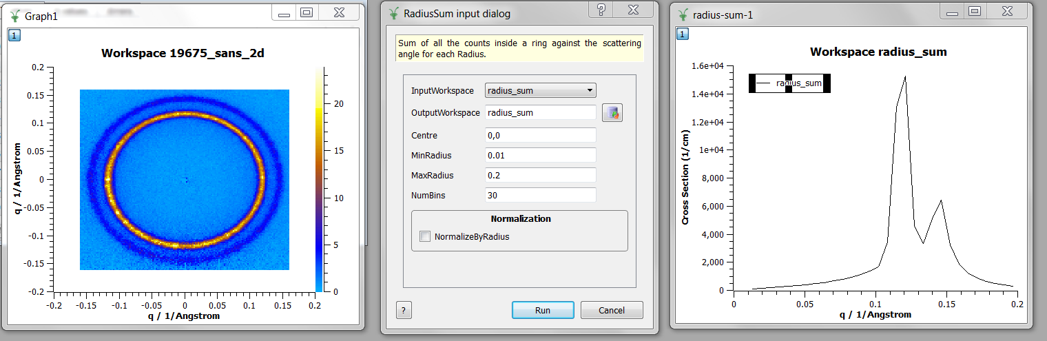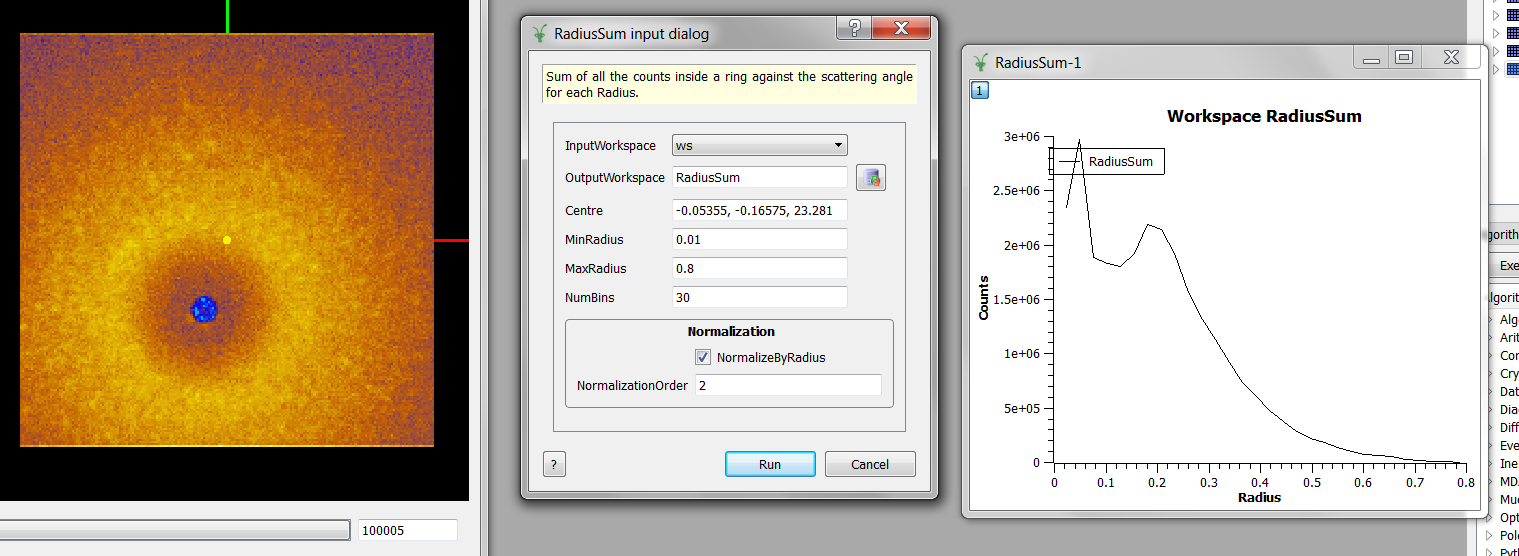 Below, there is an example of the execution of the RadiusSum to a Workspace2D where the position of the pixels are not associated to detector positions, but it is derived from the Axes.