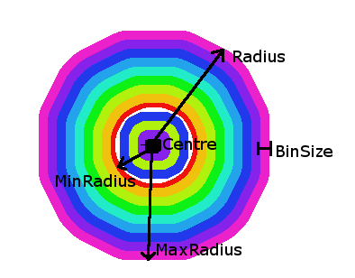 The Algorithm create NumBins rings around the Centre point each one with \(width = BinSize\) for \(BinSize=\frac{MaxRadius-MinRadius}{NumBins}\).