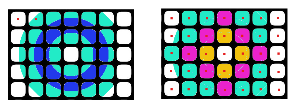 The algorithm applies a rudimentary calculation to define the bin for each that each pixel or detector in the Workspace2D, but taking its center point. If the center point belongs to one bin, it is considered that the whole pixel belongs to the bin. The picture below, shows what does this means. An ideal solution for RadiusSum is the left image, while the right image is what is current implemented.