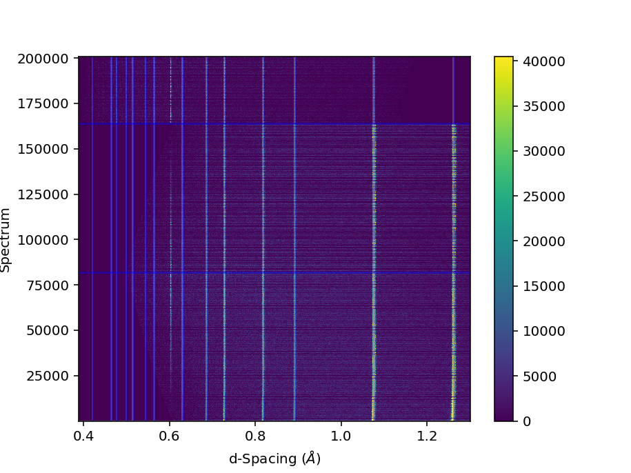 Take a look at the data using the SpectrumViewer or a color map plot, find the workspace index of a spectrum that has the peak close to the known reference position. This will be the reference spectra and will be used in the next step.