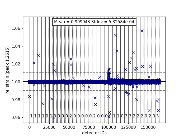 Plotting the relative strain of the d-spacing for a peak to the nominal d value (\(\frac{observed}{expected}\)) can be used as another method to check the calibration consistency at the pixel level. The relative strain is plotted along the Y-axis for each detector pixel, with the mean and standard deviation reported on the plot. A solid black line is drawn at the mean, and two dashed lines are drawn above and below the mean by a threshold percentage (one percent of the mean by default). This can be used to determine which pixels are bad up to a specific threshold.