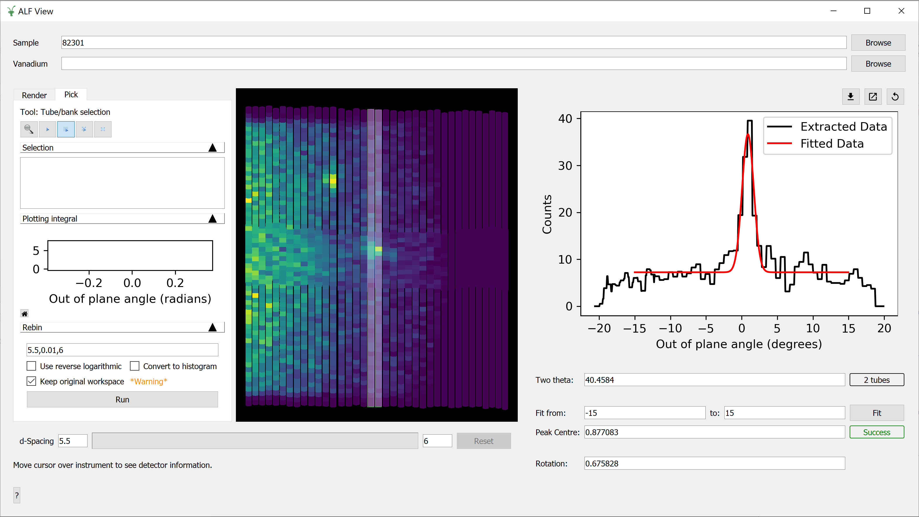 Once you have selected a tube, a plot of the out of plane angle vs counts is plotted on the right hand side of the interface.