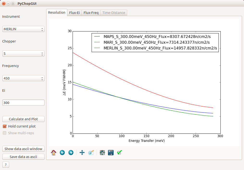 The flux and elastic resolution as a function of chopper frequency for the specified Ei is shown in the Flux-Freq plot tab. If Hold current plot is selected then several settings can be overplotted. The program will not overplot if it detects that only the frequency has changed.