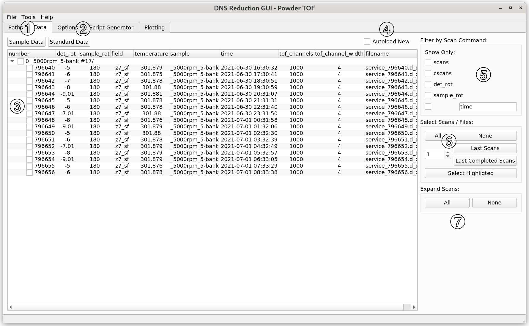 (1) Click on the Sample Data button to select sample data files for reduction from all sample files that are contained in the Data Directory (as specified in the Paths tab). By default, the interface will look for and load all the sample and standard data files that are found in the respective folders (if any files are found), when the user switches between “Paths” and “Data” tabs.