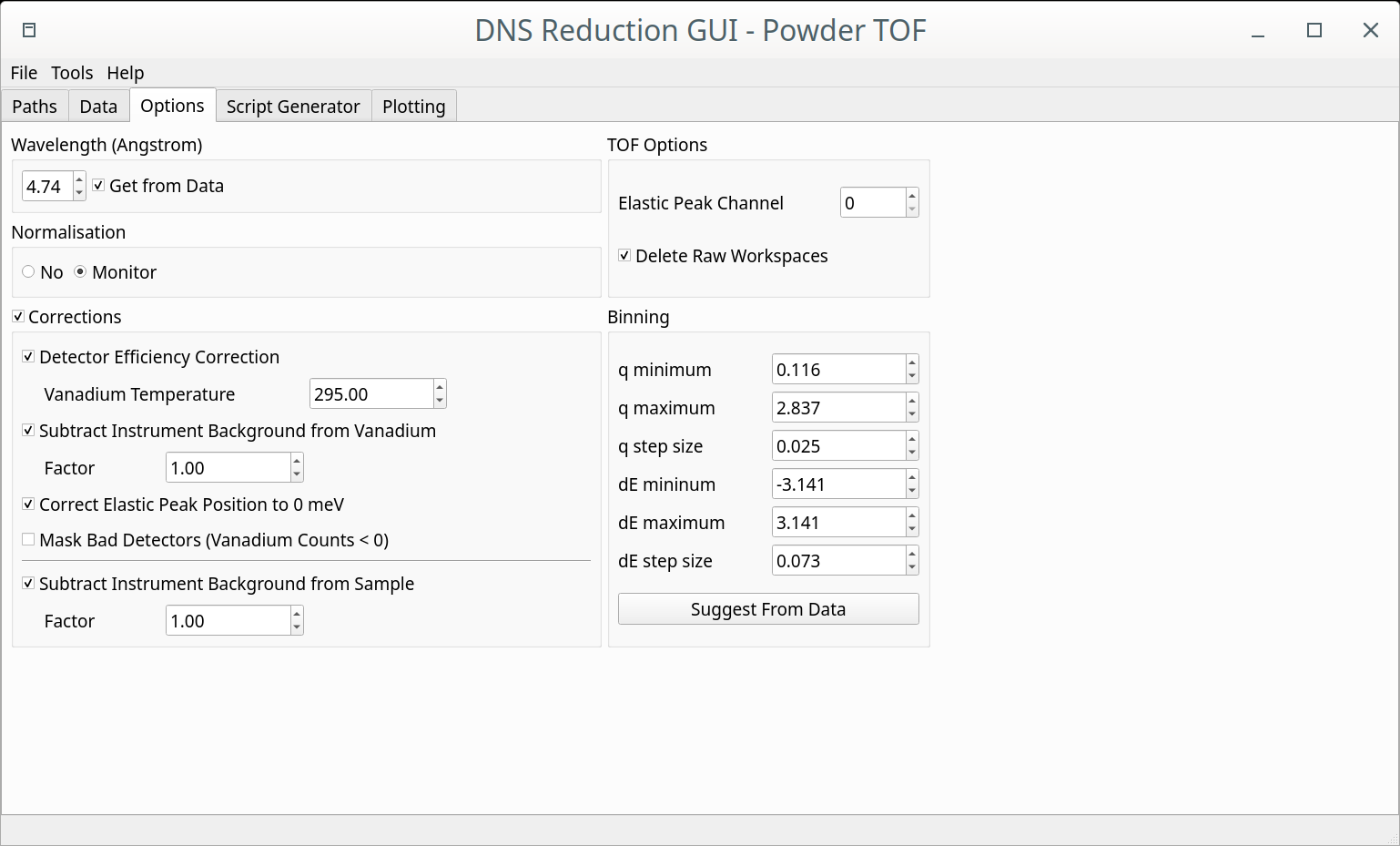 This tab of the powder TOF mode defines the options for the reduction script. The most useful configuration is preselected so that one just needs to set the binning and proceed to the next tab if no change to the selected options is desired.