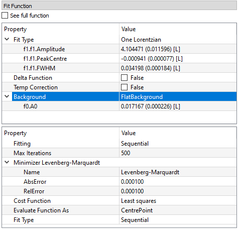 There are two modes which can be used to select functions. The default version allows easy selection of the most commonly used function models. The options in this mode differ for each of the four fitting tabs so more detailed information is given in the specific sections below. The other mode, which may be switched to bu ticking the See full function box, displays the generic function browser in which any function model can be specified.