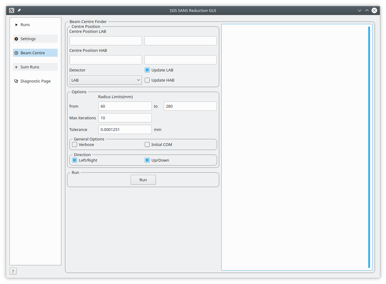 The beam centre tab allows the position of the beam centre to be set either manually by the user or by running the beam centre finder.