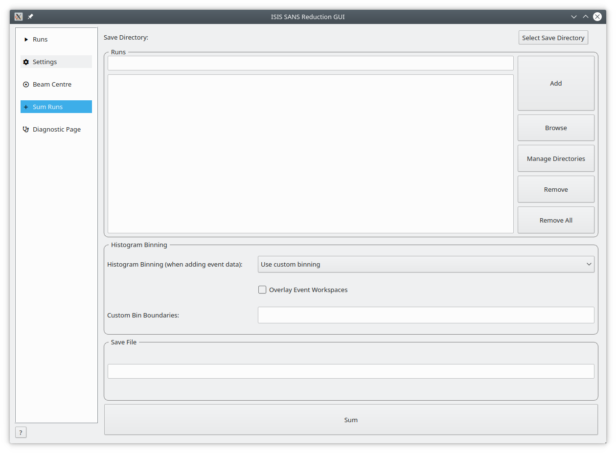 The Add Runs page provides a simple tool for adding similar runs (usually of short duration) together. The user builds a list of multiple histogram or event files (but not mixed) before pressing the sum button to produce a single output file in the mantid output directory.