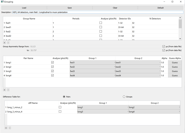 Group Asymmetry Range Controls the range to use when estimating the group asymmetry. The values are used as StartX and EndX in EstimateMuonAsymmetryFromCounts. By default this range is the first good data and end time value from the file
