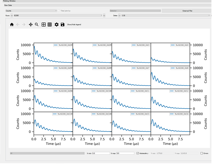 This can be used for inspecting individual detectors for potential faults. There are two selectors above the plot; one for runs and one for detectors. The runs selector allows the user to pick the run they want to plot (when loading multiple runs). The ‘detectors’ selector allows the user to choose the detectors they want to inspect. Only tiled plots can be shown and to improve the visibility of the plots the axis are identical for all subplots.