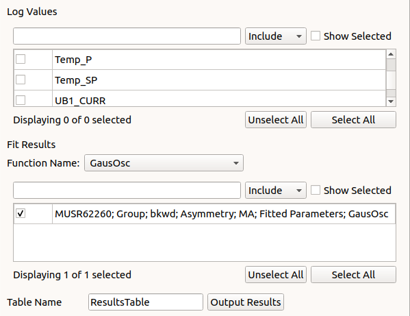 The results tab outputs the results from the fitting tab as well as the log values from selected runs into a tableworkspace.