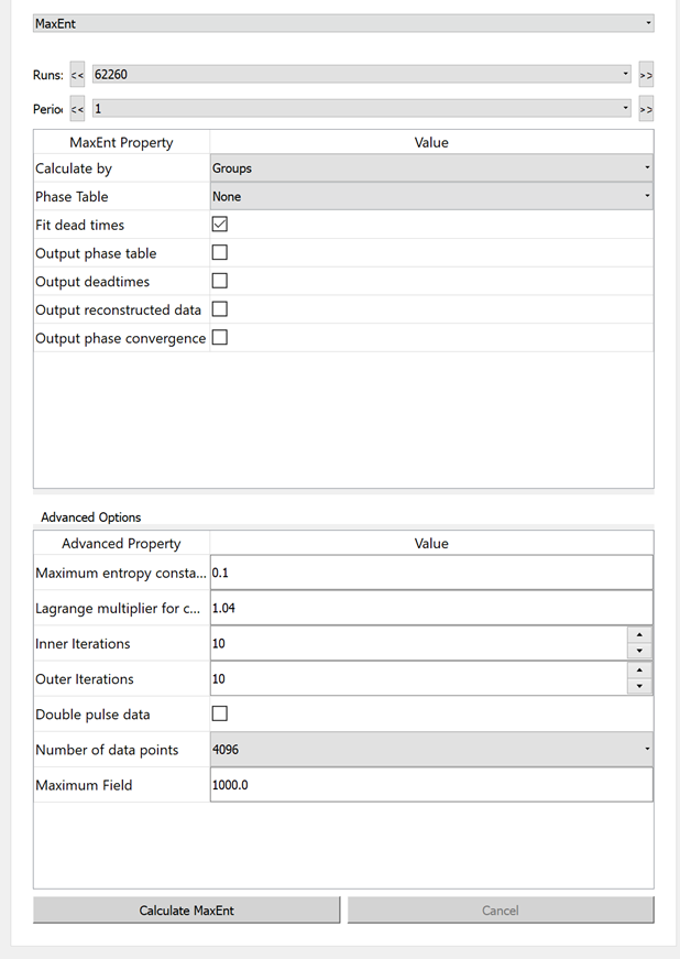 The maximum entropy method can be used to calculate the frequency domain spectrum. This option uses the MuonMaxent algorithm to calculate the frequency spectrum. The MaxEnt Property table contains the basic quantities used during the calculation.