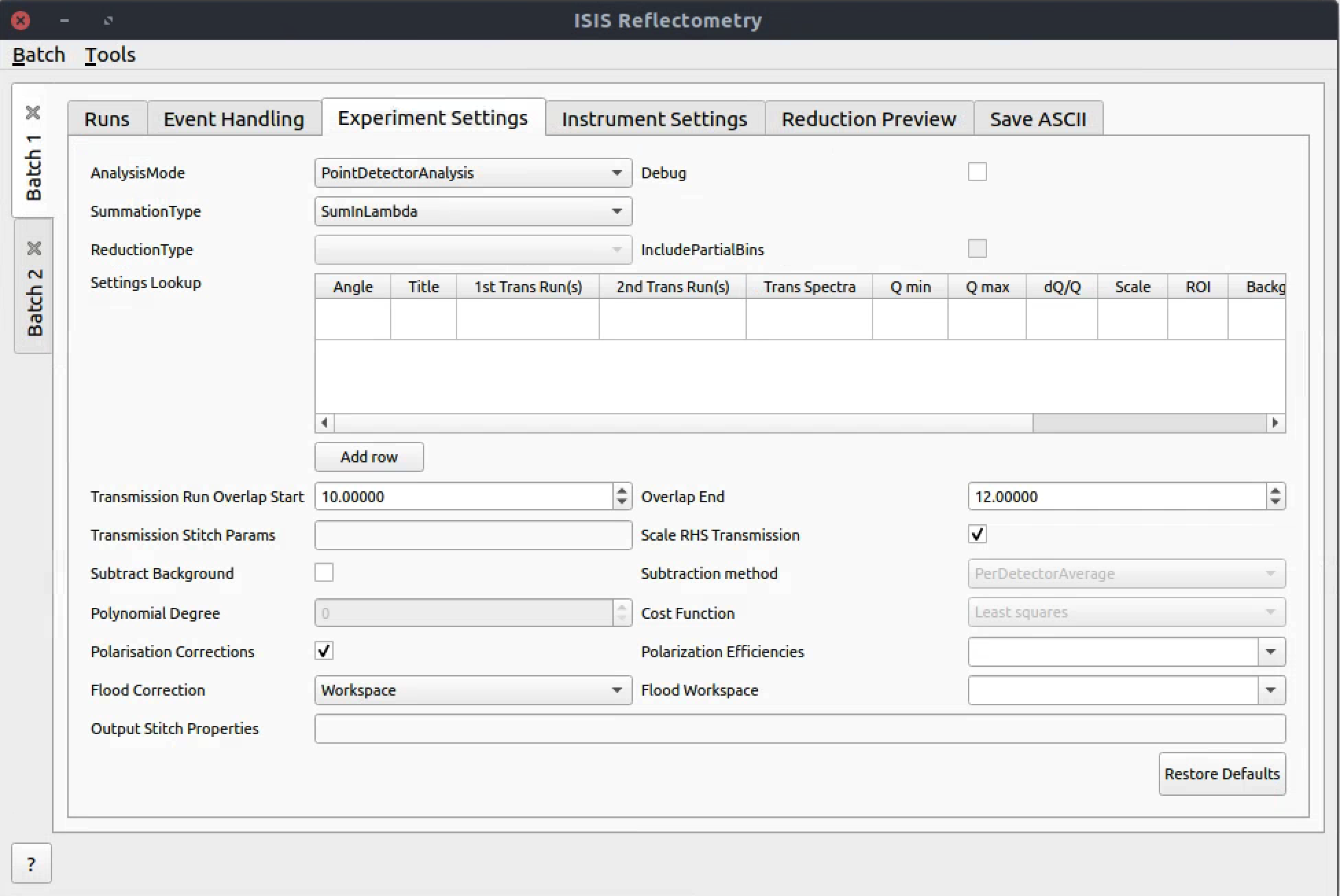 The Experiment Settings and Instrument Settings tabs can be used to specify options for the reduction and post-processing releting to a specific experiment. The Experiment settings are variables that are mostly set by the user, whereas the Instrument Settings are variables relating to the instrument used to perform the reduction. Both are populated with default values for the current instrument. The Restore Defaults button allows you to revert the settings to the default values for the instrument.