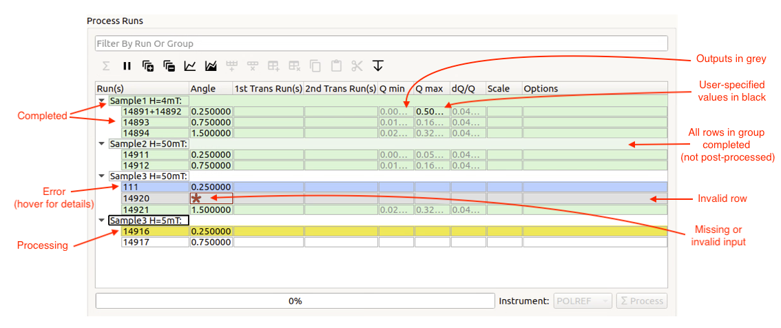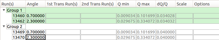 Each row represents a single reduction (i.e. execution of ReflectometryReductionOneAuto), and belongs to a group. Rows that are grouped together will have their output stitched together using Stitch1DMany.