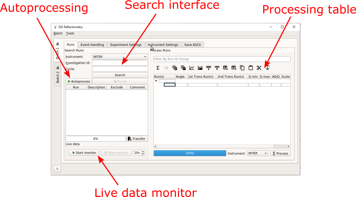 The main window contains one or more “Batches”, which are shown as vertical tabs on the left. Each Batch contains a group of settings tabs (Runs, Event Handling, Experiment, Instrument and Save). Together, these provide all of the settings for a particular reduction.