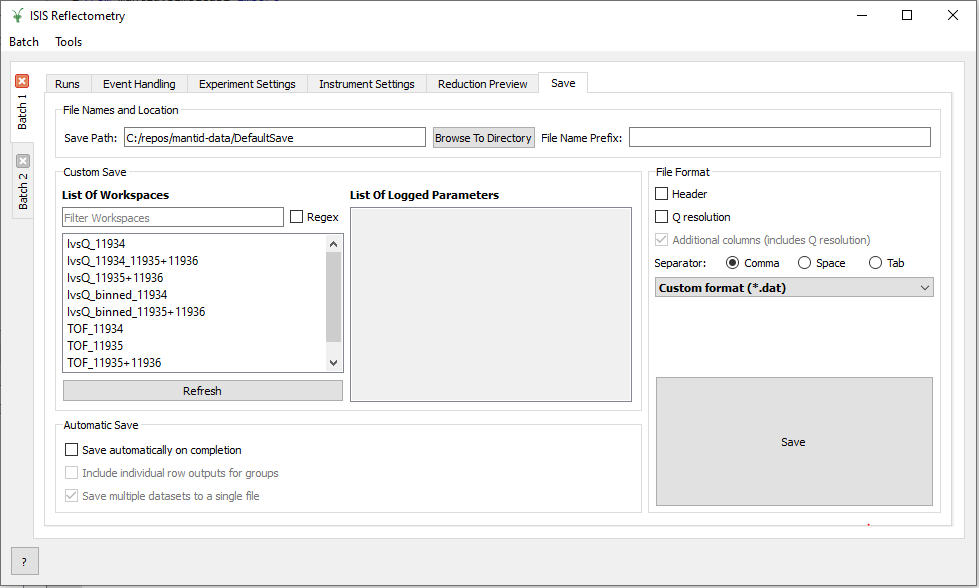 The Save tab allows for processed workspaces to be saved in specific formats. The filenames are saved in the form [Prefix][Workspace Name].[ext]. See SaveReflectometryAscii v1 and SaveISISReflectometryORSO v1 for a description of the supported formats.