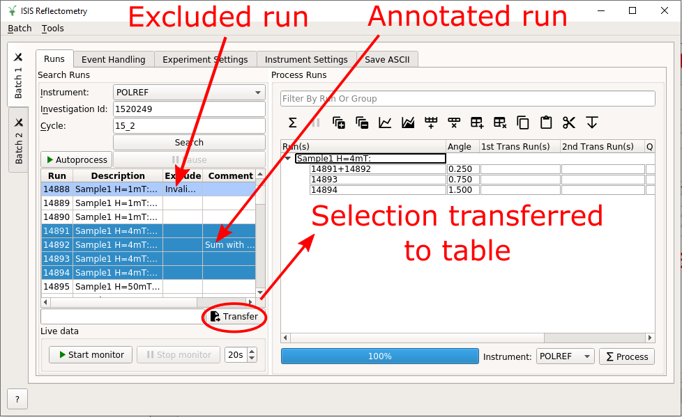 Run numbers and angles entered into the runs table¶