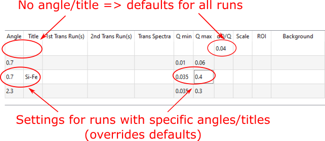 First, we want to enter the runs that we will process into the table. Enter the values as shown in the figure below. Just the run number and the angle is the minimum requirement.