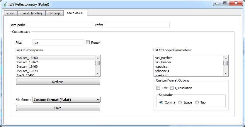 A new tab, ‘Save ASCII’ has been added. This tab is similar in function and purpose to the ‘Save Workspaces’ window accessible from Interfaces->ISIS Reflectometry->File->Save Workspaces.