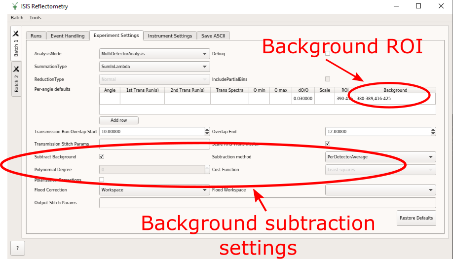 Background subtraction options have been added to the ISIS Reflectometry Interface. The subtraction is performed using the ReflectometryBackgroundSubtraction v1 algorithm.