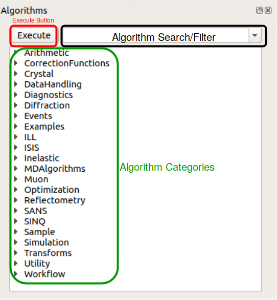 The algorithm toolbox offers access to all of Mantid’s algorithms. The algorithms are listed in categories and there is also a search bar.