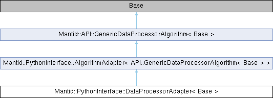 Public Member Functions inherited from Mantid::PythonInterface::AlgorithmAdapter< API::GenericDataProcessorAlgorithm< Base > > | |