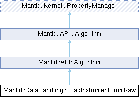 LoadInstrumentFromRaw is intended to be used as a child algorithm of other Loadxxx algorithms, rather than being used directly. LoadInstrumentFromRaw is an algorithm and as such inherits from the Algorithm class, via DataHandlingCommand, and overrides the init() & exec() methods.